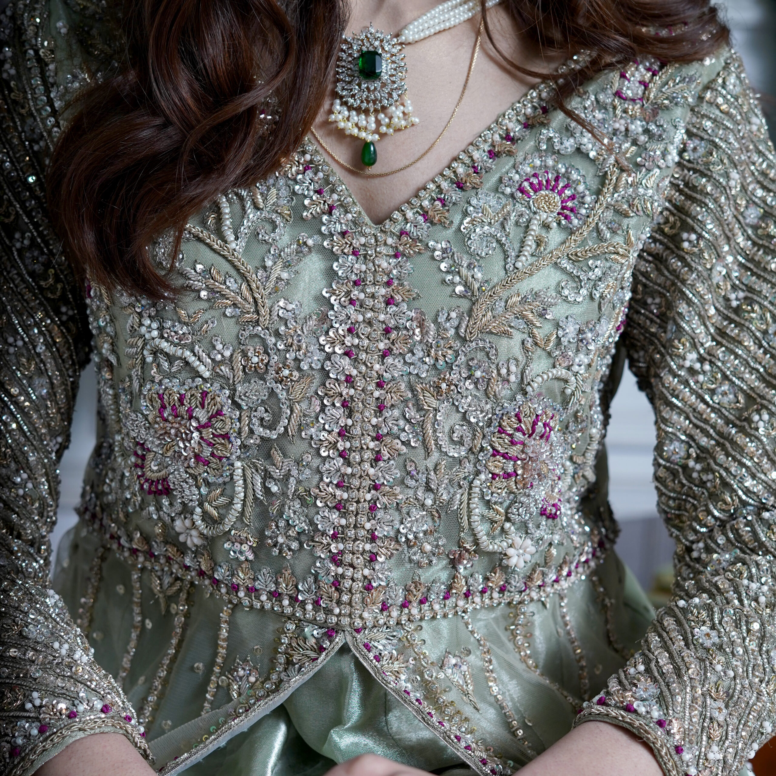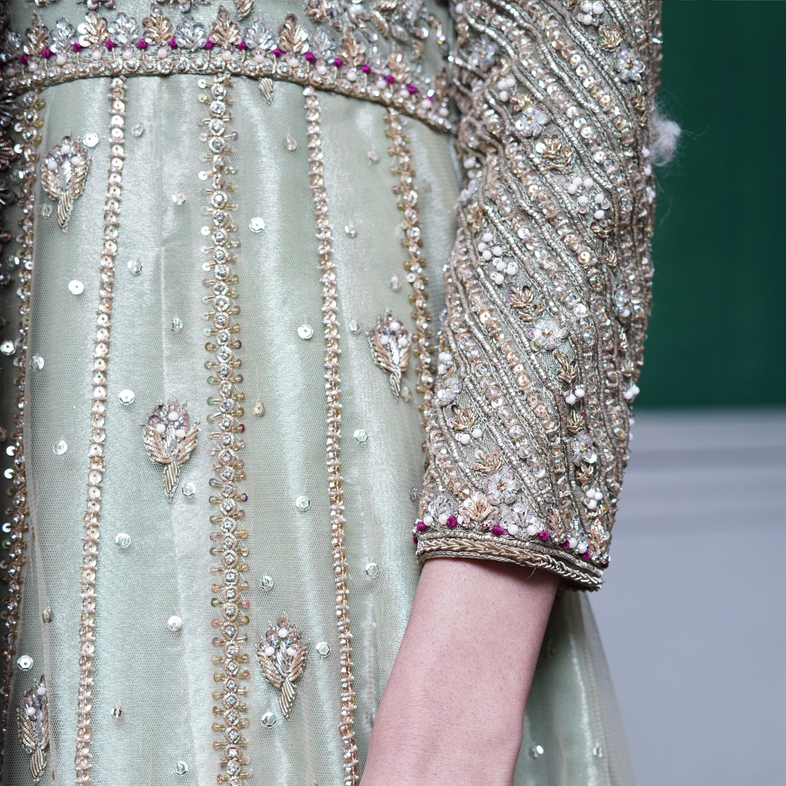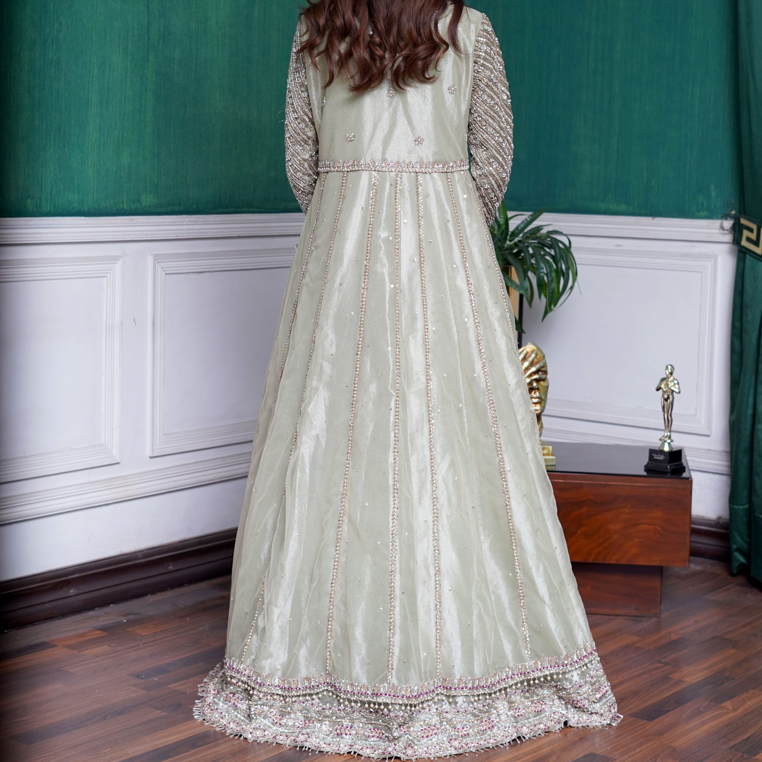 A graceful Pistachio Green Maxi crafted from delicate Net fabric, featuring intricate embellishments of Resham, Moti, Sitara, Dhabka, Stones, and Crystals, adding a touch of timeless elegance.